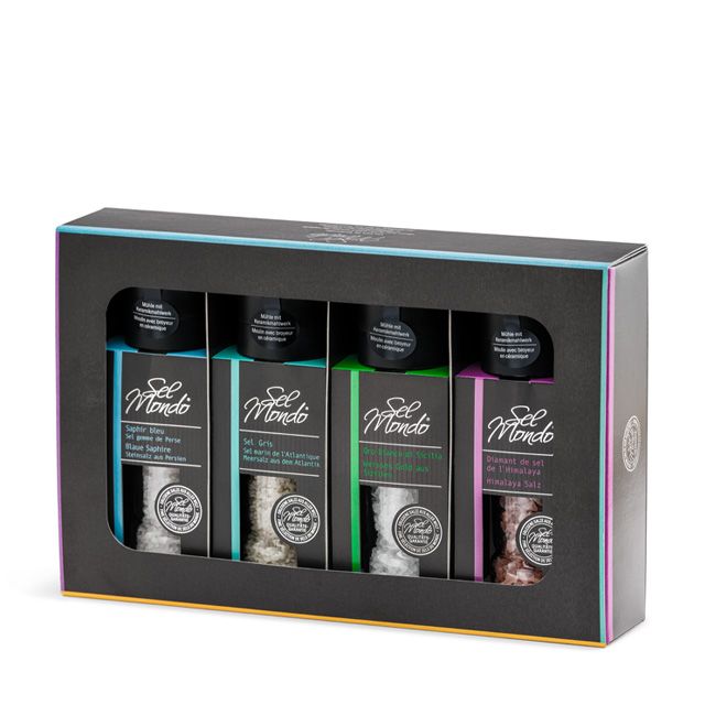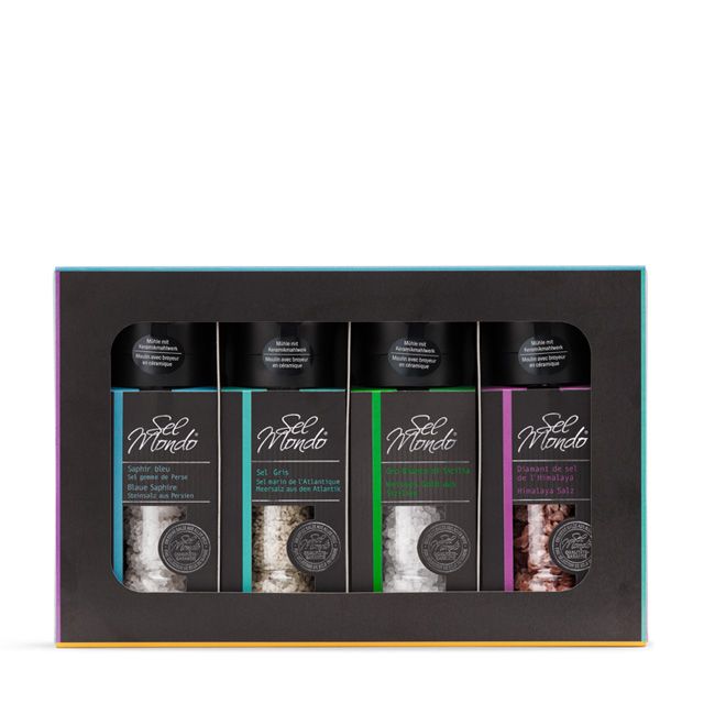 Bringen Sie Abwechslung auf Ihren Esstisch - mit dem Mühlen-Set von SelMondo. Hierzu haben wir für Sie die besten Salze aus aller Welt in einer einzigartigen Kollektion zusammengestellt: Salz aus dem Himalaya, die Blauen Saphire aus dem Iran, Sel Gris aus dem Atlantik sowie das Weisse Gold Siziliens. Für feinste Mahlergebnisse sind alle Salzmühlen mit einem hochwertigen Keramik-Mahlwerk ausgestattet. SelMondo ist damit ein ideales Geschenk für jeden Anlass und wird den höchsten Ansprüchen bei der Verfeinerung ihrer Speisen gerecht.